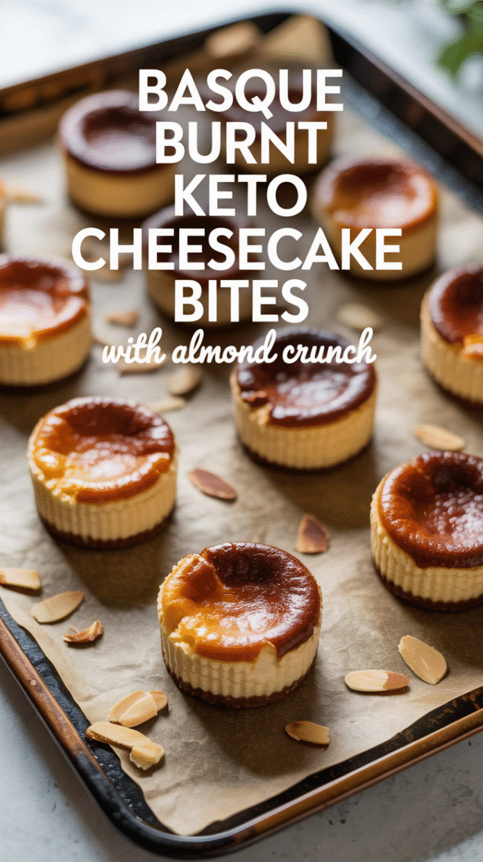 Mini, caramelized-top cheesecake bites with a shattery almond crunch—rich, creamy, and only about 2g net carbs each. These crustless Basque-style cheesecakes bake hot and fast for that signature bronzed top and custardy center. Perfect for make-ahead treats, party trays, or a small-bite dessert that delivers big wow.