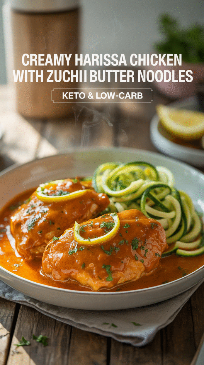 Juicy chicken thighs simmered in a velvety harissa cream sauce and served over glossy zucchini “butter” noodles. It’s comfort food the keto way: rich, satisfying, and ready in about 30 minutes.