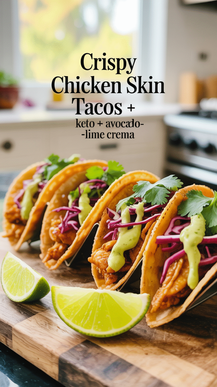 These crispy chicken skin tacos are a game-changing keto dinner. Ultra-crunchy “shells” made from roasted chicken skin cradle juicy shredded chicken, a tangy cabbage slaw, and a silky avocado-lime crema. Big flavor, minimal carbs, and ready in about 30 minutes.