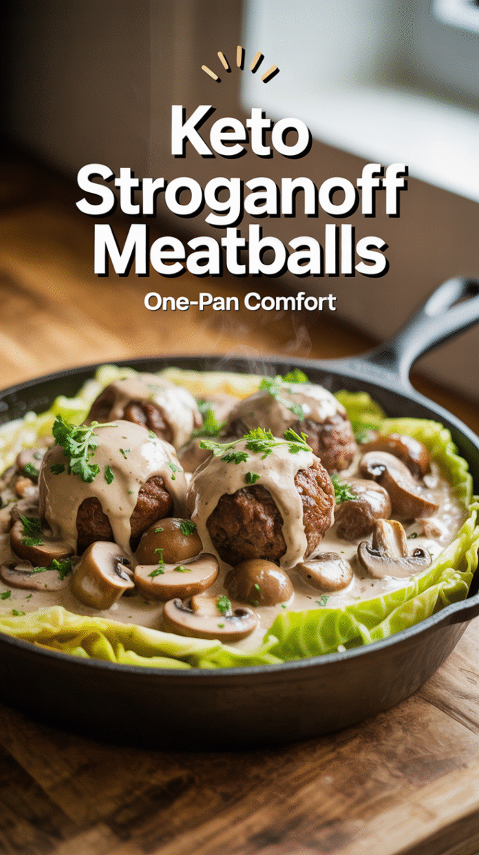 Cozy comfort food meets weeknight ease. These keto stroganoff meatballs simmer in a silky mushroom cream sauce and land on a bed of buttery sautéed cabbage “noodles.” It’s a one-pan dinner that feels special but cooks fast, with rich flavor and minimal carbs.