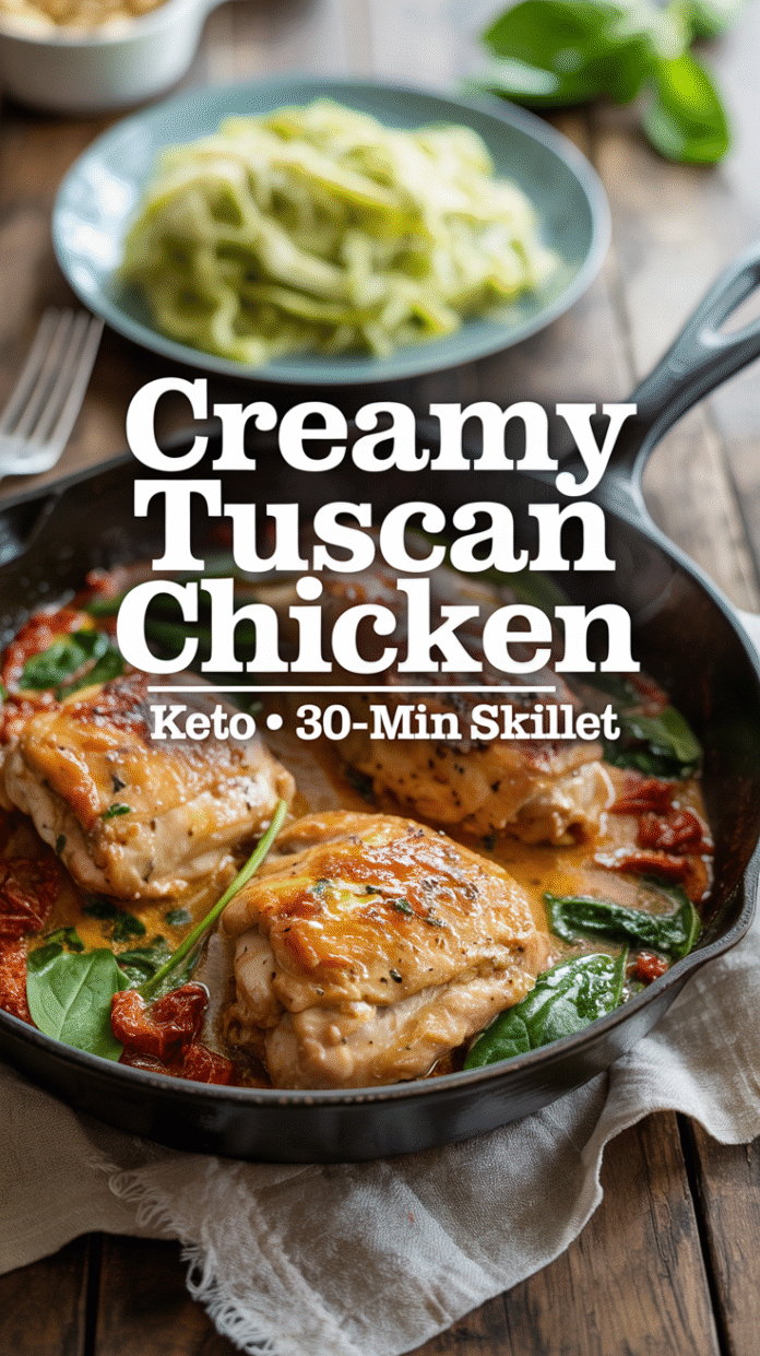 Skillet Tuscan Chicken in Sun‑Dried Tomato Cream over Cabbage “Fettuccine” is weeknight comfort in 30 minutes. Golden-seared chicken simmers in a silky, garlicky cream sauce with sun‑dried tomatoes and spinach, then gets piled over buttery cabbage ribbons for a pasta-style keto dinner that tastes restaurant-worthy.